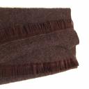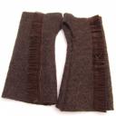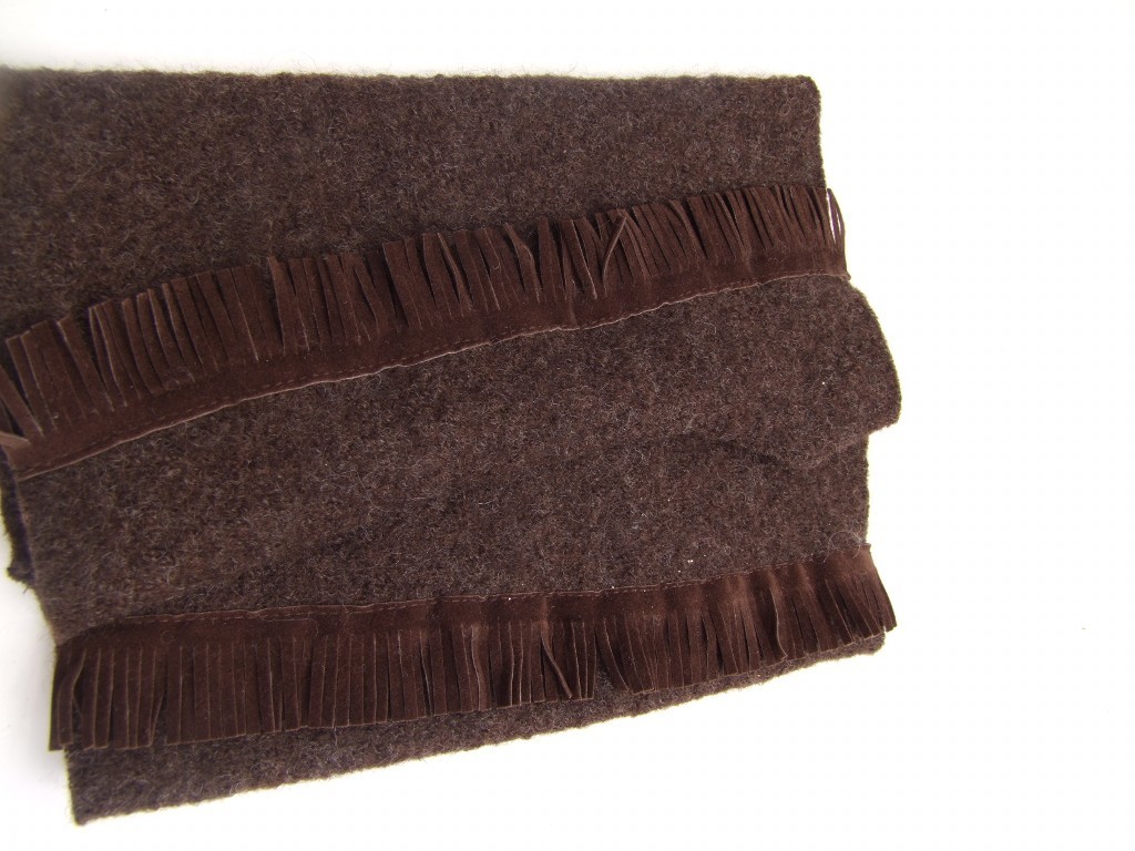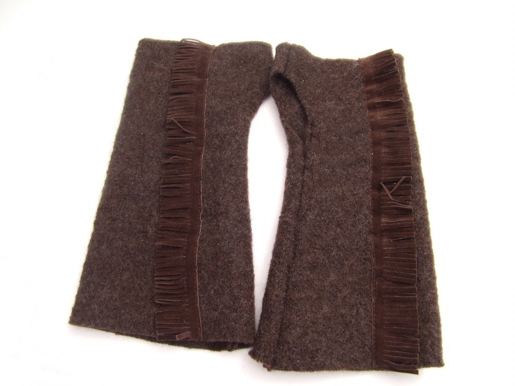 Braune Stulpen aus Wollwalk mit eienr Fransenborte aus Kunstleder.