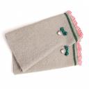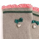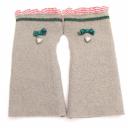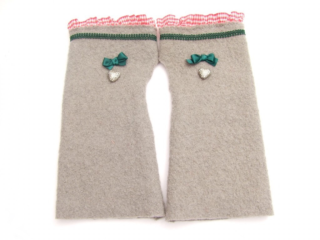 Graue Stulpen aus Wollwalk mit Posamentenborte,einer Satinschleife und einem karierten Rüschenbad. Und was beim Trachtenlook natürlich nicht fehlen darf, ein Herz.