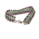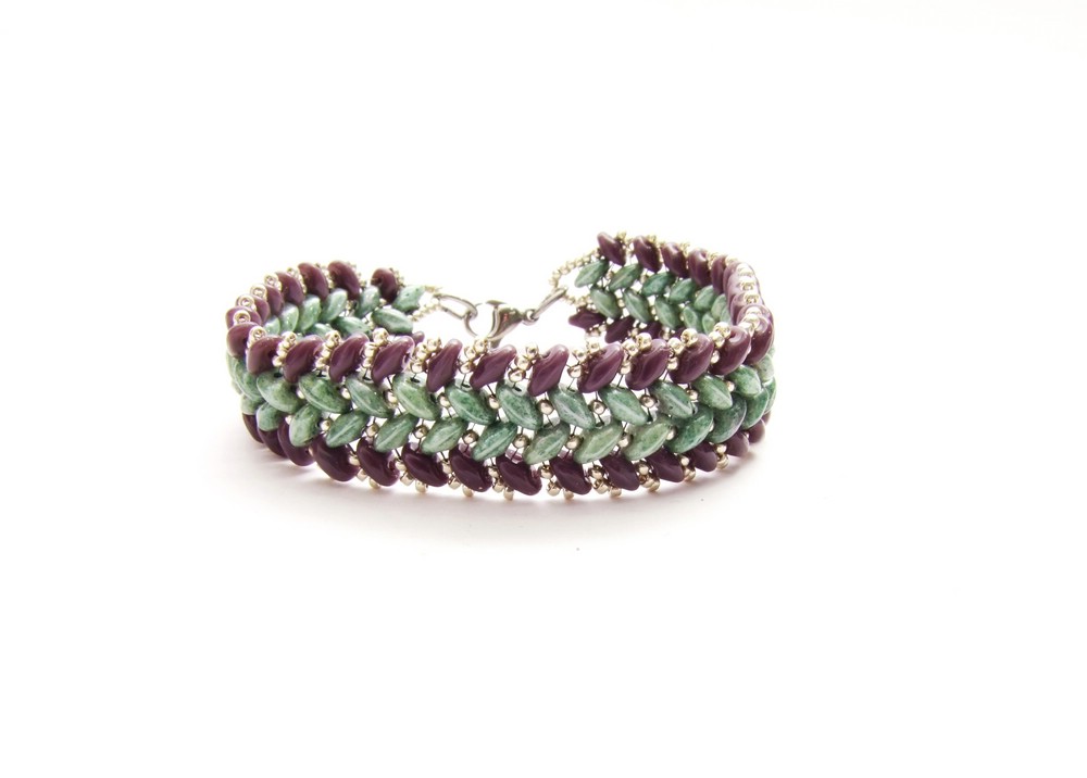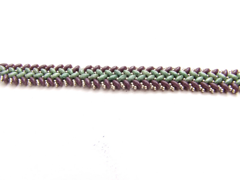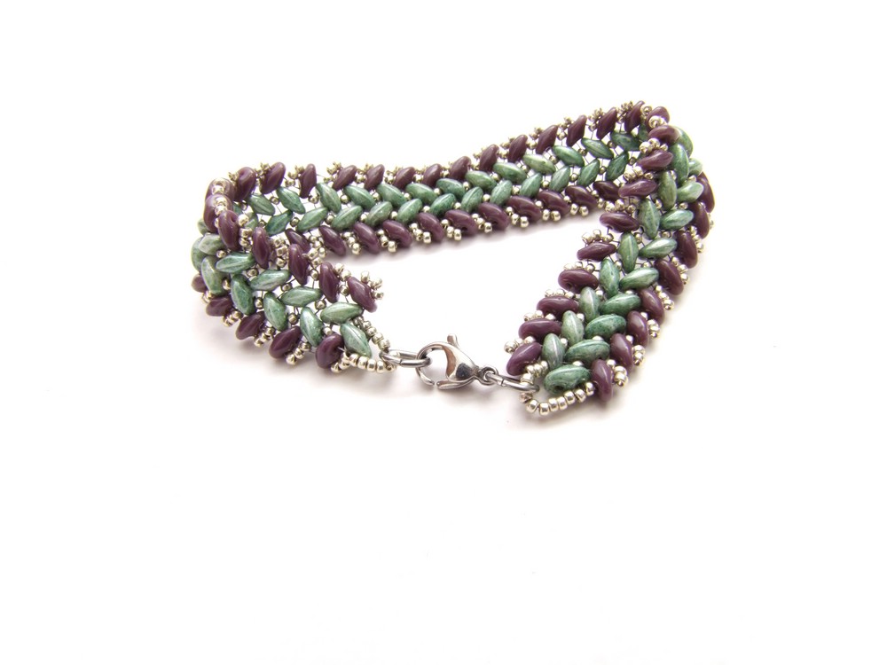 Geschmeidiges Armband mit grünen und lilafarbenen Superduos und silbernen Rocailles.