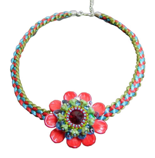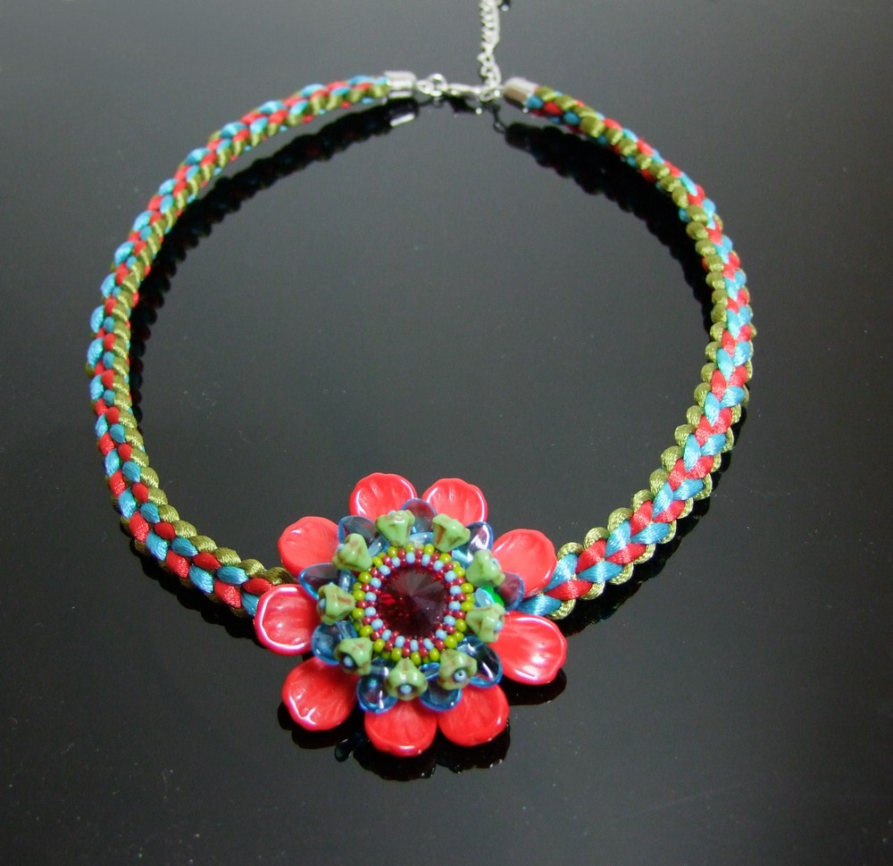 Eine Kette, die im Kumihimo-Stil geflochten ist, ergänzt durch einen Anhänger in harmonierenden Farben.