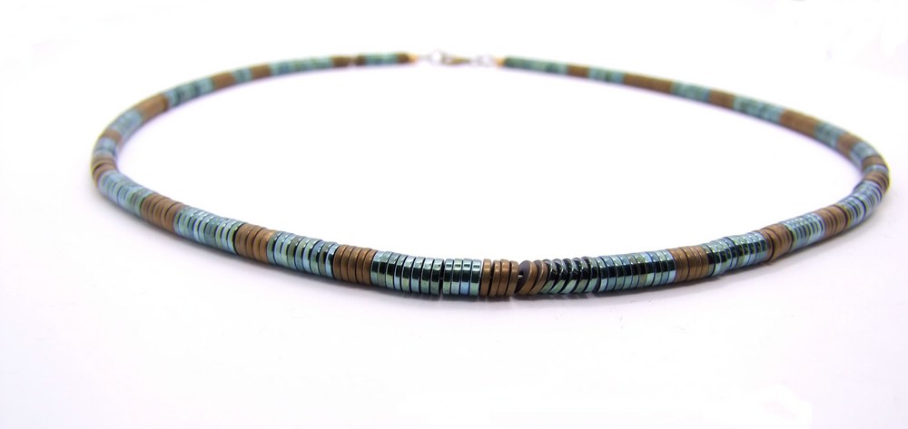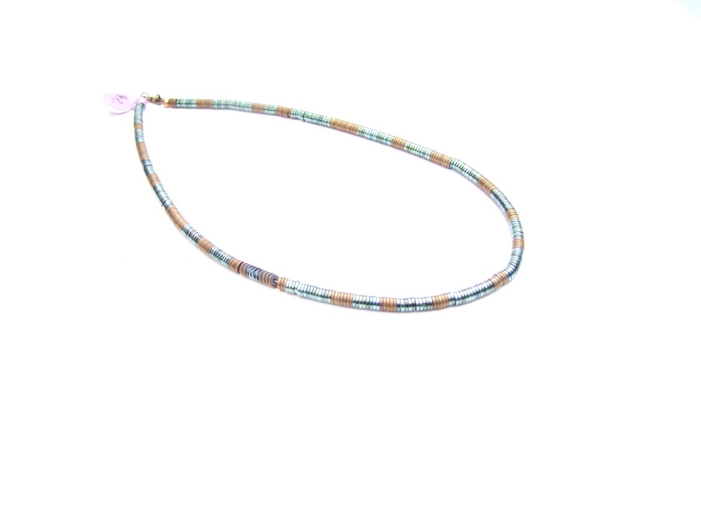 Kette aus vielen Hämatitscheiben in den Farben grün/messing.