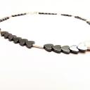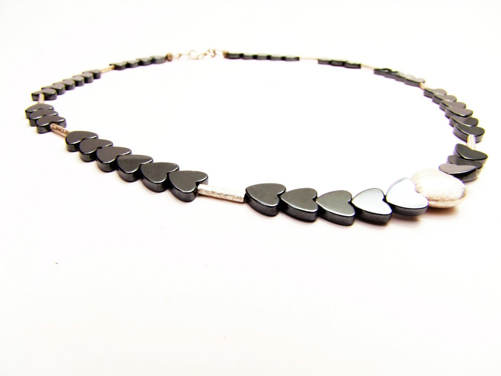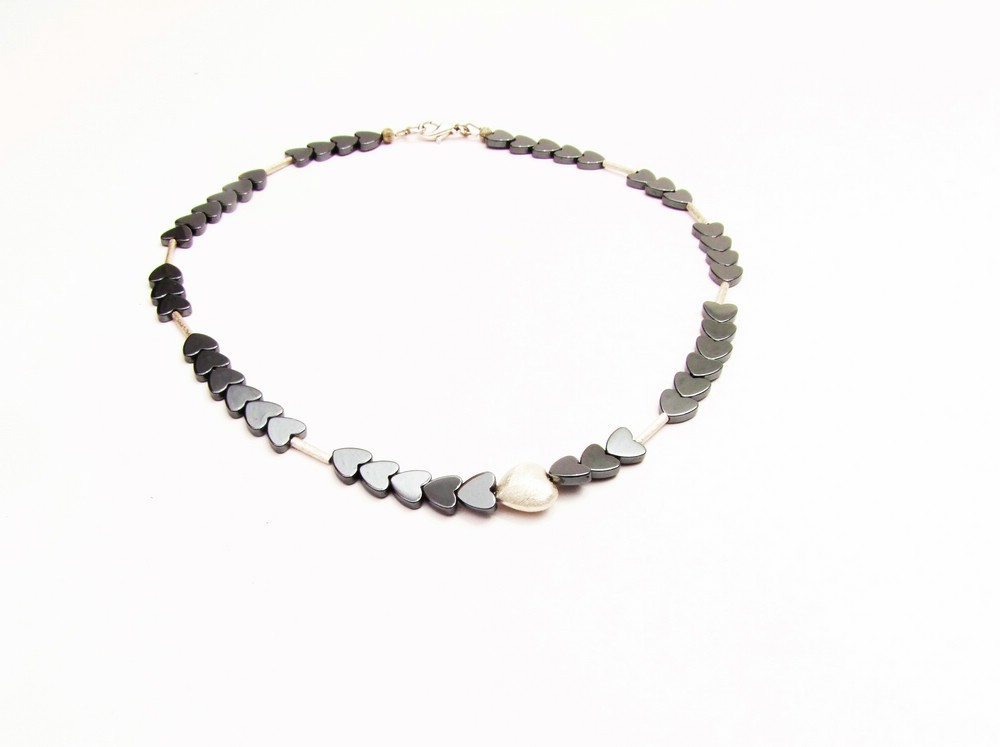 Die Kette ist mit Herzen aus Hämatit, Silberröhrchen und einem Silberherz geschmückt und strahlt Eleganz aus.