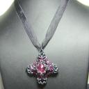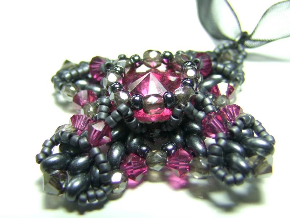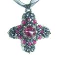 Dieser aufwendig gefädelte Kreuz-Anhänger ist ein echter Blickfang. Der zentrale pinke Swarovski Rivoli wird von schimmernden schwarzen Perlen umrahmt, was ihm Eleganz verleiht. Er hängt an einem transparenten, schwarzen Band, das die Farben harmonisch verbindet und dem Schmuckstück eine moderne Ausstrahlung gibt.