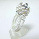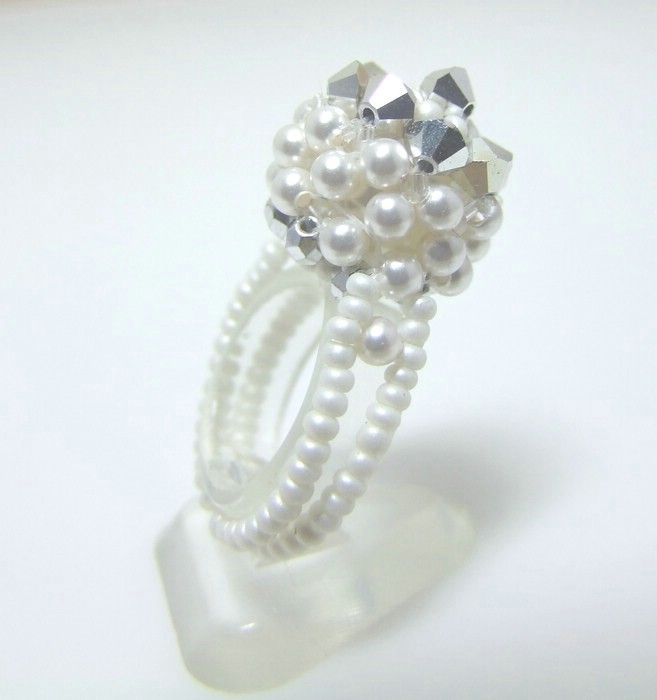 Wunderschöner Kugelring mir silbernen Swarovski Schliffperlen und cremefarbenen Crystal Pearls und Rocailles.