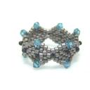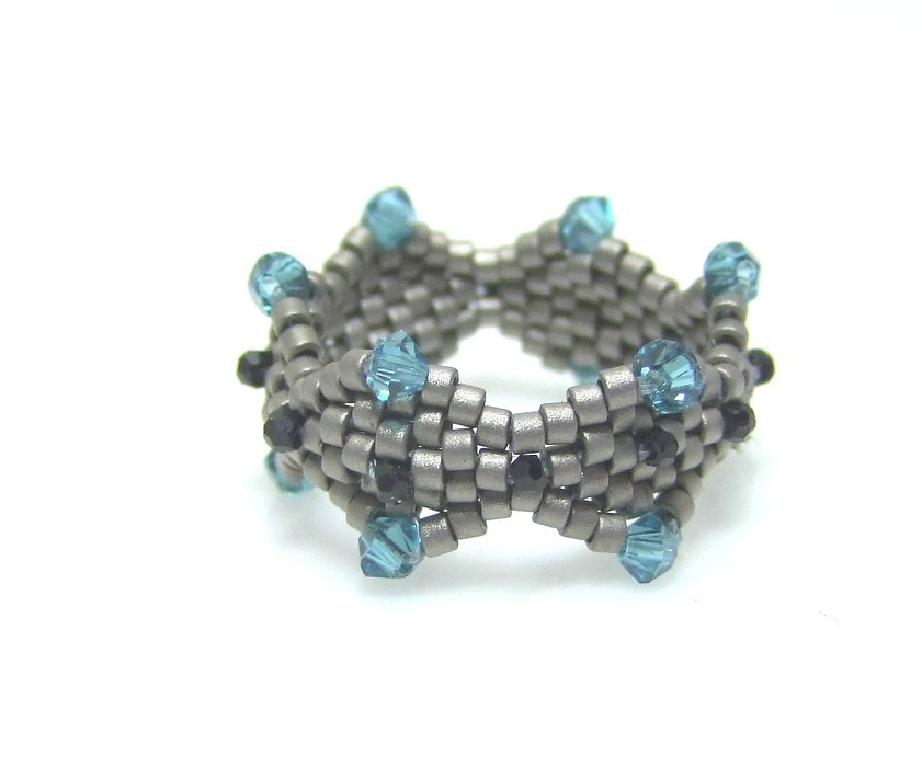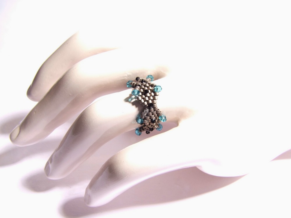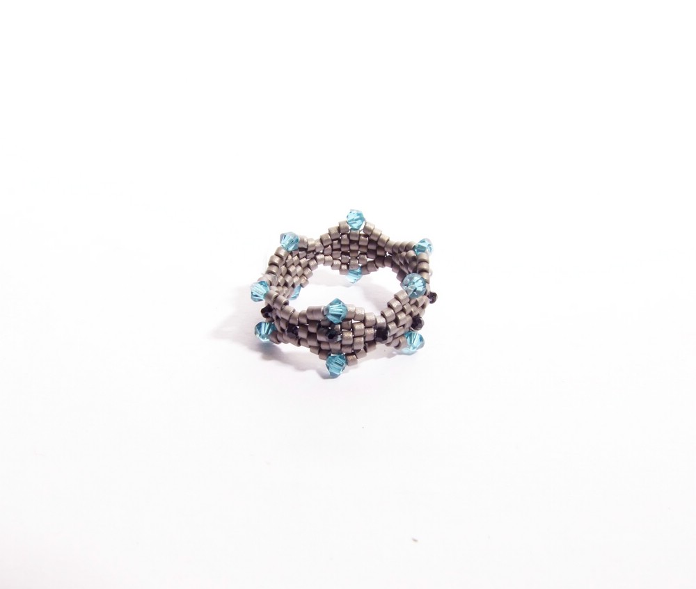 Zackenring in grau/türkis mit Swarovski Schliffperlen.