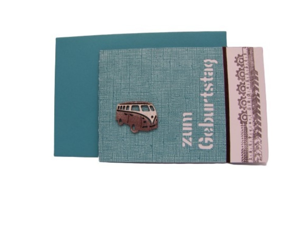 Türkise Karte mit einem Bulli und gestanztem Schriftzug.