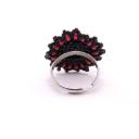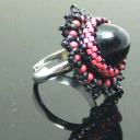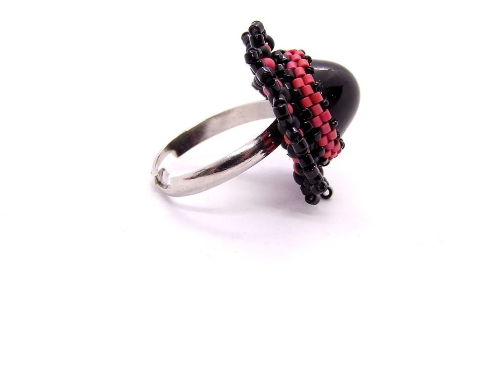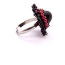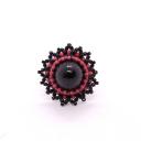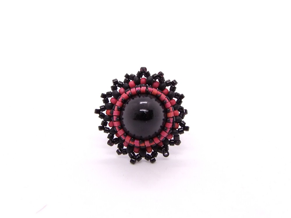 Schwarzer Glascabochon, umperlt in schwarz rot mit Spitzenrand.