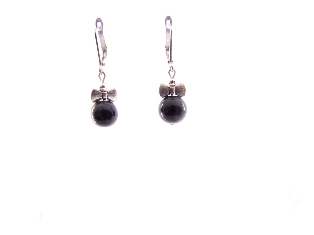 Schlichte, schwarze Ohrringe mit silbernen Schleifchen als Verzierung.