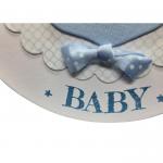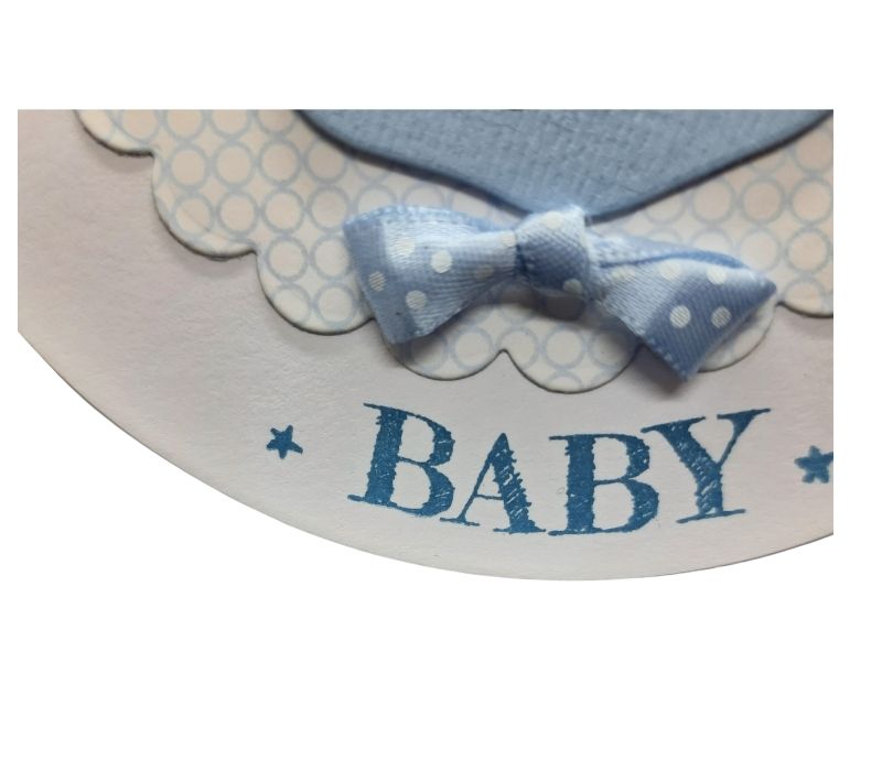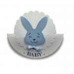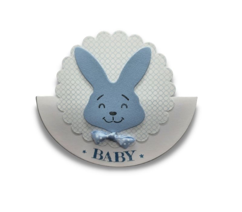 Schaukelkarte mit einem hellblauen Hasengesicht und einer Stoffschleife.