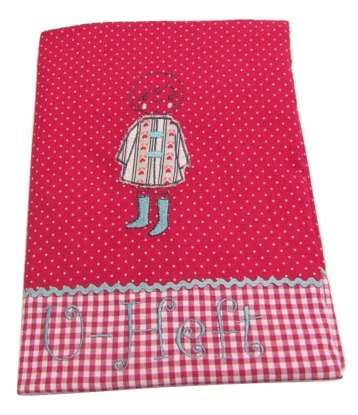U-Heft Hülle in hellblau/pink, verziert mit einer charmanten Stickerei eines Mädchens im Mantel.
