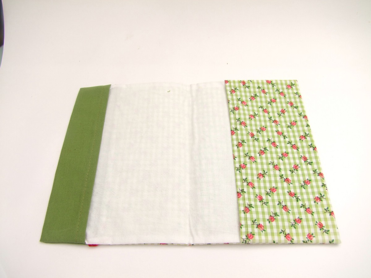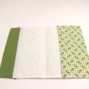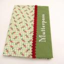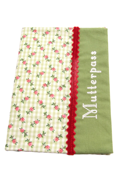 Mutterpasshülle in Grüntönen, mit Blümchenmuster und Zackenlitze aus Samt. Der Schriftzug ist gestickt.