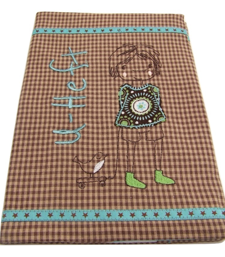 U-Heft-Hülle, bestickt mit einem kleinen Jungen und einem Ziehspielzeug.